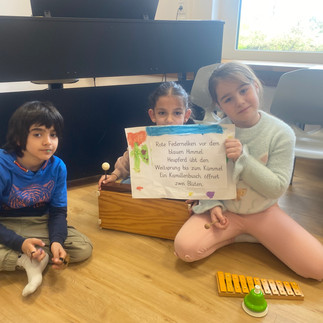 Die Wiese kann man aber nicht nur sehen, es gibt auch einiges zu hören: mithilfe ihrer Bilder und des Textes finden die Kinder in Gruppenarbeit passende Instrumente für ihre Verse. Ist es ein leises/lautes, hohes/tiefes, schnelles/ langsames, kurzes oder langes Geräusch? Erklingen mehrere Instrumente gleichzeitig?