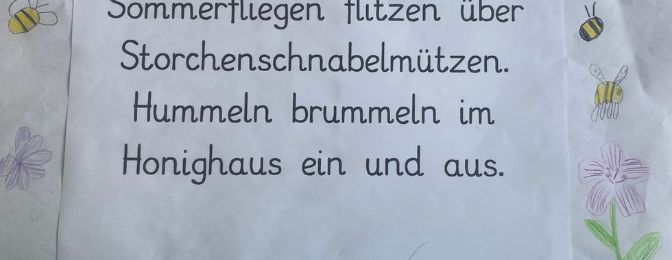 In der Lesestunde haben die Kinder der Klasse 2b ein Gedicht gelesen: "Was ist eine Wiese?" Von Friedl Hofbauer. Da ist ganz schön was los! Damit alles auch gesehen wird, malen die Kinder an Stationen, was in den Versen passiert.
